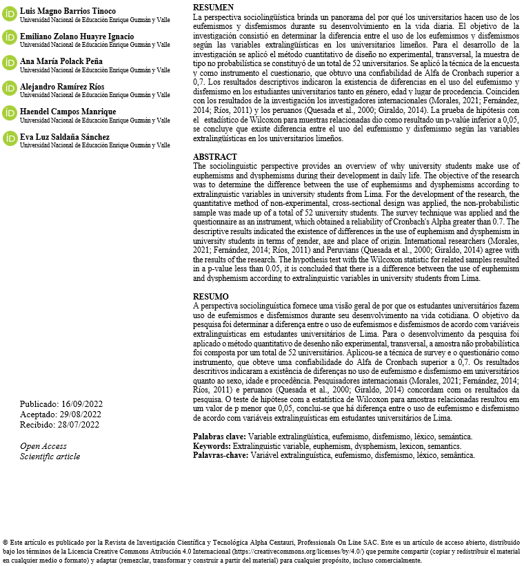 La investigación propone determinar la diferencia en el uso del eufemismo y disfemismo según las variables extralingüísticas en los universitarios limeños. Los sujetos de investigación fueron 280 estudiantes la Facultad de Ciencias Sociales y Humanidades, 2021-II, Universidad Nacional de Educación Enrique Guzmán y Valle. Se aplicaron tres instrumentos en la recolección de datos: Cuestionarios Variables extralingüísticas, para la recopilación de edad, género y lugar de procedencia; asimismo, Uso de eufemismo y Uso de disfemismo, cada cuestionario conformado por de 10 ítems con la técnica de Likert en una escala del 1 a 5 (muy en desacuerdo, en desacuerdo, ni en desacuerdo, ni de acuerdo, de acuerdo y muy de acuerdo). La aplicación del estadístico de Wilcoxon para muestras relacionadas y una significancia inferior a 0,05 (0,000<0,05), permitió demostrar que existe diferencia entre el uso del eufemismo y disfemismo según las variables extralingüísticas en los universitarios limeños. Se espera que los resultados obtenidos permitan profundizar en el léxico innovador de los jóvenes universitarios limeños.