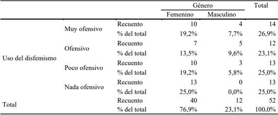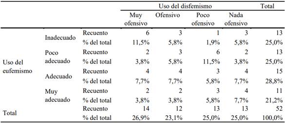 Del procesamiento de datos se obtuvieron los siguientes resultados, la tabla 1 muestra las diferencias del uso del eufemismo y disfemismo en número de estudiantes y el porcentaje de apreciación en diferentes niveles. Se observa que del 100% de estudiantes encuestados, para cualquier nivel de uso del eufemismo, el 26,9% afirmaron que el uso del disfemismo es muy ofensivo, el 23,1% coincidieron que es ofensivo, el 25% que es poco ofensivo y el 25% que es nada ofensivo.