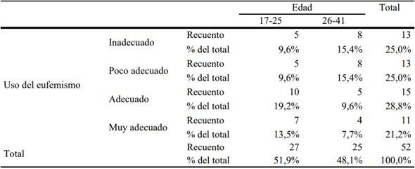 La tabla 3 muestra las diferencias del uso del eufemismo según edad en número de estudiantes y el porcentaje de apreciación en diferentes niveles. Se observa que del 100% de estudiantes encuestados, el 51,9% están en el rango de 17-25 años y 48,1% en el rango de 26- 41 años.