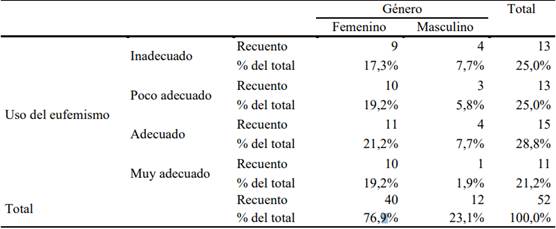La tabla 5 muestra las diferencias del uso del eufemismo según género en número de estudiantes y el porcentaje de apreciación en diferentes niveles. Se observa que del 100% de estudiantes encuestados, el 76,9% son de género femenino y 23,1% de género masculino.