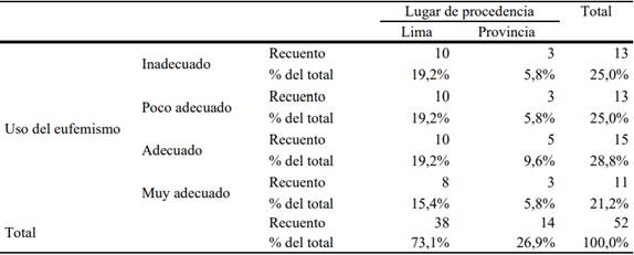 La tabla 7 muestra las diferencias del uso del eufemismo según género en número de estudiantes y el porcentaje de apreciación en diferentes niveles. Se observa que del 100% de estudiantes encuestados, el 73,1% son de Lima y 26,9% de provincia.