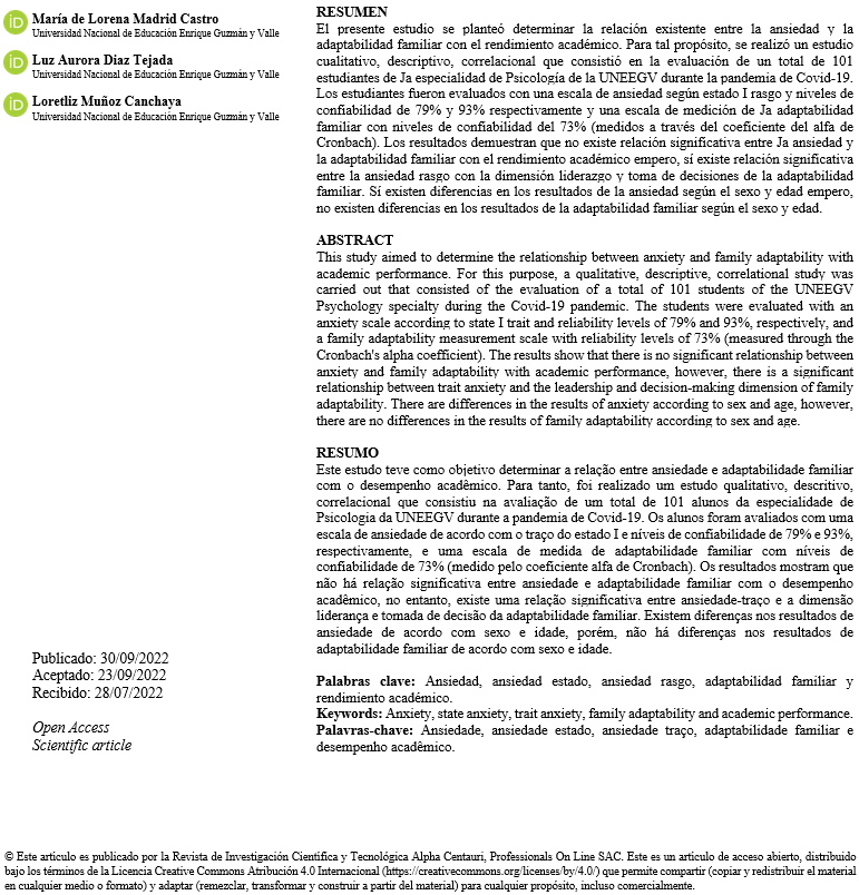 Anxiety, family adaptability and academic performance in students of the specialty of Psychology - UNEEGV during the Covid-19 pandemic