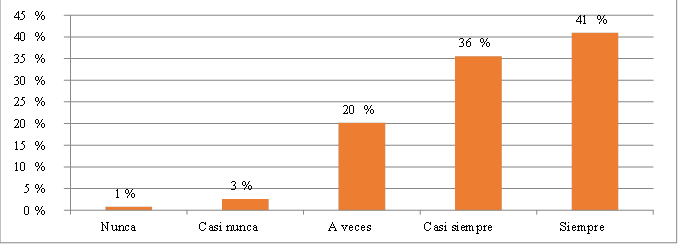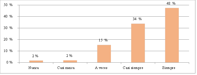 En la figura 5 se puede observar que respecto a la PPP continua el 49% respondió que siempre ha realizado las fases de planeamiento, ejecución y evaluación; seguido del 35% que aseguró que casi siempre; el 14%, a veces; el 1%, casi nunca; y el 1%, nunca; por lo que se puede concluir que la mayoría ha ejecutado las fases mencionadas durante el desarrollo de la práctica preprofesional continua.
