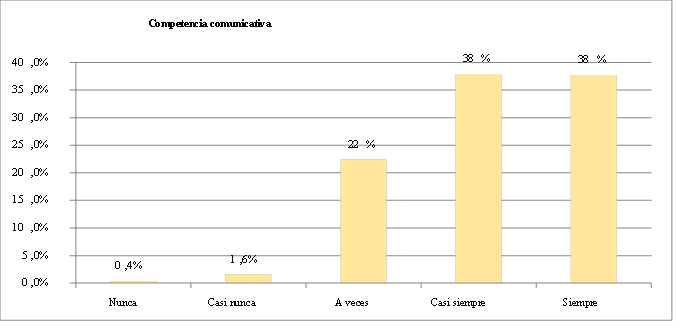 En la figura 2 se puede observar que, al desarrollar actividades propias de la competencia comunicativa, el 38% respondió que siempre desarrolla actividades de competencia comunicativa de la microenseñanza, al igual que otro 38% que aseguró que casi siempre; seguido del 22% que aseguró que a veces; el 1.6%, casi nunca; y el 0.4%, nunca; por lo que se puede concluir que la mayoría ha llevado a cabo actividades relacionadas con la dimensión Competencia comunicativa.