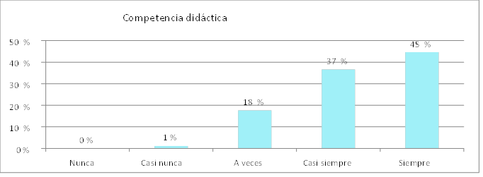 En la figura 3 se puede observar que, al desarrollar actividades propias de la competencia didáctica, el 45% respondió que siempre desarrolla actividades de competencia didáctica de la microenseñanza; seguido del 37% que aseguró que casi siempre; el 18%, a veces; el 1%, casi nunca; y el 0%, nunca; por lo que se puede concluir que la mayoría ha llevado a cabo actividades relacionadas con la dimensión Competencia didáctica.