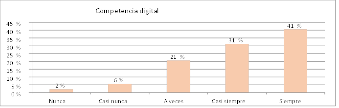 En la figura 4 se puede observar que, al desarrollar actividades propias de la competencia digital, el 41% siempre desarrolla actividades de competencia digital de la microenseñanza; seguido del 31% que aseguró que casi siempre; el 21%, a veces; el 6%, casi nunca; y el 2%, nunca; por lo que se puede concluir que la mayoría ha llevado a cabo actividades relacionadas con la dimensión Competencia digital.