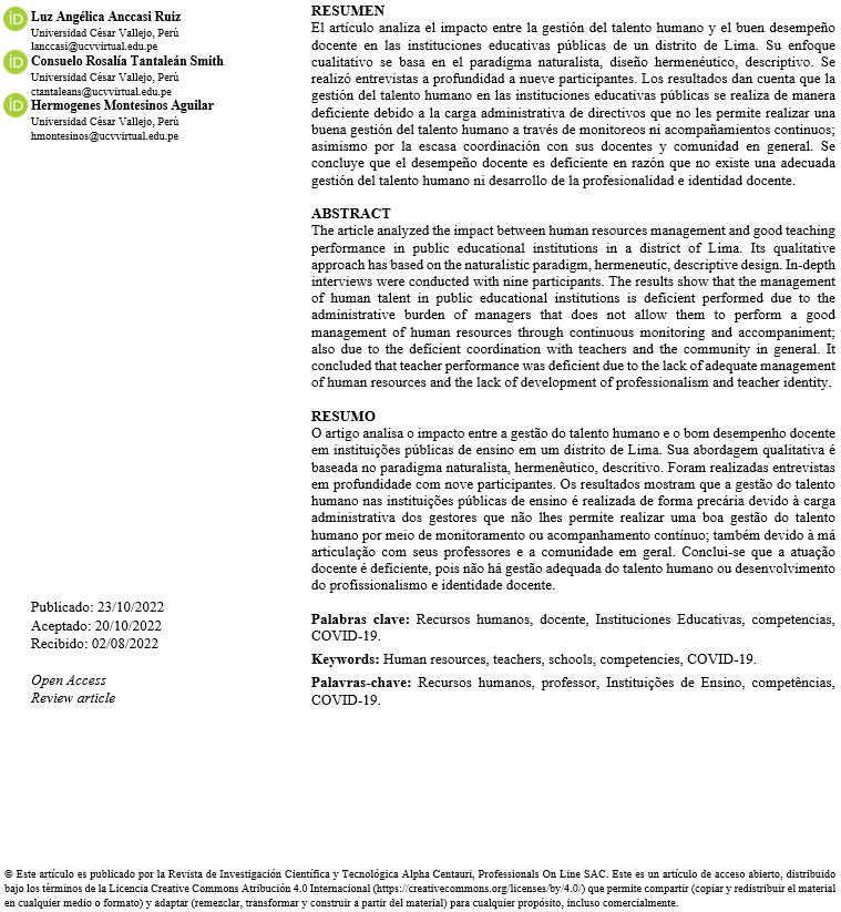 Human talent management for teaching performance in public educational institutions in times of pandemic