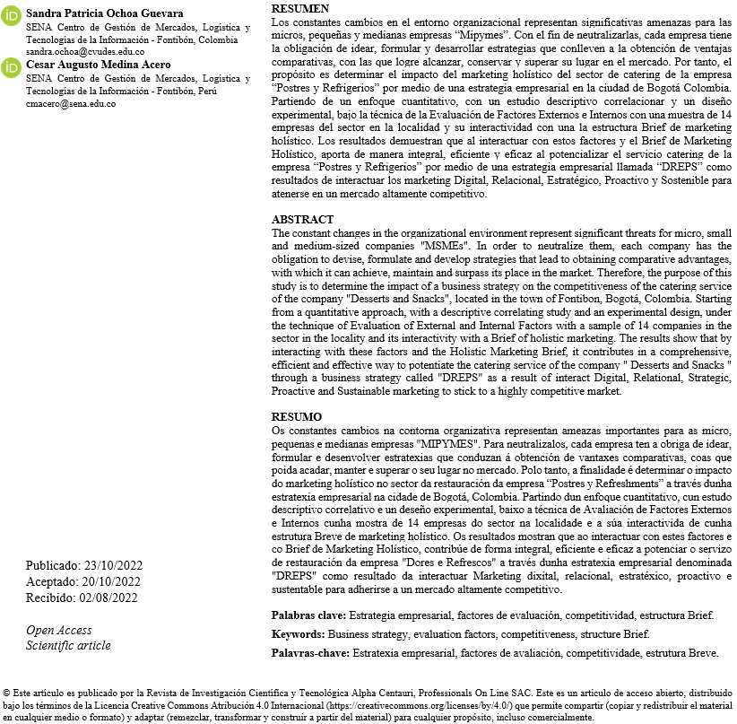 De ahí que la importancia de esta investigación radique en indagar ¿De qué manera una estrategia empresarial del Marketing Holístico logra potenciar las Mipymes del Sector de los Servicios de Catering en la localidad de Fontibón en Bogotá -Colombia? Su propósito es determinar una estrategia empresarial de MH que permita potenciar estas Mipymes en el sector con el apoyo de un enfoque cuantitativo, bajo un estudio descriptivo correlacional y un diseño no experimenta con una encuesta cerrada realizada a 14 empresas bajo las categorías integrales del MH en el sector de Catering de la localidad con influencia directa con la empresa objeto de estudio “Postre y Refrigerios”. De igual forma, se aplica la matriz de factores internos y externos (MEFI) / (MEFE) que facilita el análisis del contexto de la organización identificando tanto las fortalezas como debilidades existentes en las áreas de la empresa “Postres y Refrigerios”, acompañada de la técnica de Brief desde el MH como aporte a la estrategia empresarial esperada, siendo el objeto de estudio.