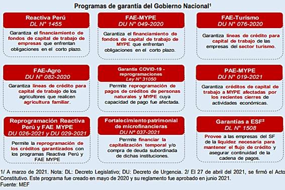 El incentivo mediante políticas económicas por parte del estado tuvo el propósito de garantizar el movimiento en la cadena de pagos, la solidez de las inversiones con el fin de impedir una intensa depresión que cause un masivo cese de actividades laborales en los trabajadores y ocasione el cierre de organizaciones empresariales (Instituto Peruano de Economía, 2021) Estas disposiciones aplicadas están orientadas a garantizar el movimiento económico de 31,457 mil millones de dólares que constituyen el 14.7% del PBI como primera etapa, hasta llegar al 17%. Este programa de apoyo económico contemplaba: a) Disposiciones de carácter tributario ascendente a 4,62 mil millones de dólares destinados a detener el pago por concepto de impuestos a las familias, organizaciones empresariales y otorgar beneficios administrativos. b) Disposiciones para el gasto de 2,92 mil millones de dólares destinados al servicio de urgencias de salud, apoyo a la economía familiar y sustento a la economía empresarial en sus distintos niveles. c) Diversas disposiciones dirigidas al exoneramiento de los aportes excepcionales de las instituciones financieras administradoras de fondos de pensiones y a implementar un plan financiero designado Reactiva Perú, que centralizaba 17,14 mil millones de dólares correspondientes a entidades empresariales (MEF, 2020). El Banco Central de Reserva del Perú –BCRP- de acuerdo con el MEF –Ministerio de Economía y Fianzas- planean el fortalecimiento del programa de incentivos económicos mediante disposiciones como: a) Disminución de los porcentajes de interés de las medidas en cuanto a políticas monetarias, en el periodo de marzo-abril, el porcentaje promedio vario de 2,25% a 0,25%, siendo una política monetaria de carácter expansivo. b) Adaptabilidad de los requisitos de enganche económico en soles variando de 5% a 4%, reduciéndose la tasa destinada a compromisos en dólares a tiempos por debajo de dos años para organismos internacionales de 50% a 4%. c) Suministro de fluidez al rubro de inversiones, adjudicando operaciones con capital garantizado por el estado para hacer más flexible refinanciar el sistema empresarial prestatario y planteo proyectos que afiancen la agenda de créditos correspondientes al empresariado deudor. d) Disminución de la inestabilidad en los porcentajes de intereses a largo plazo y tipo cambiario, el Banco Central de Reserva del Perú –BCRP- ofreció movimientos de bonos soberanos y adquisición directa de divisa internacional a las empresas que administran fondos pensionarios para disminuir la libre disponibilidad de una fracción de los fondos de pensiones de sus afiliados. e) El gobierno, el mes de junio, reconoce las limitaciones que presentó en relación a la identificación de hogares familiares con nivel de vulnerabilidad e individuos que se dedican a labores informales, determinando políticas para corregir este hecho basados en la focalización por medio de la dirección de ENAHO, para de esta manera adjudicar un beneficio de apoyo económico con el programa designado como Bono Familiar Universal (BCR, 2020).