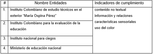 Se pudo conocer que un 40% de las entidades se encuentra en nivel A, donde uno o más de sus indicadores cumplen con los respectivos criterios de accesibilidad mientras que el otro 60% se encuentra en la categoría AA, cumpliendo a cabalidad con la mayoría de indicadores, criterios y requerimientos que se necesitan para acceder a esta categoría, siendo estos los de mayor rango en el sistema evaluativo que se trabaja en la investigación.