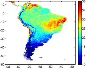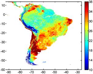 La presente contribución propone la estimación de la TS a baja resolución durante el periodo 2001 para América del Sur obtenidos del sensor MODIS a bordo de los satélites AQUA y TERRA.