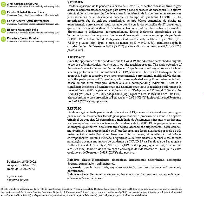 En efecto, el presente estudio pretende determinar la incidencia del uso de las herramientas sincrónicas y asincrónicas en el desempeño docente en tiempo de pandemia COVID 19 de la Facultad de Pedagogía y Cultura Física de la UNE-EGyV, 2021.