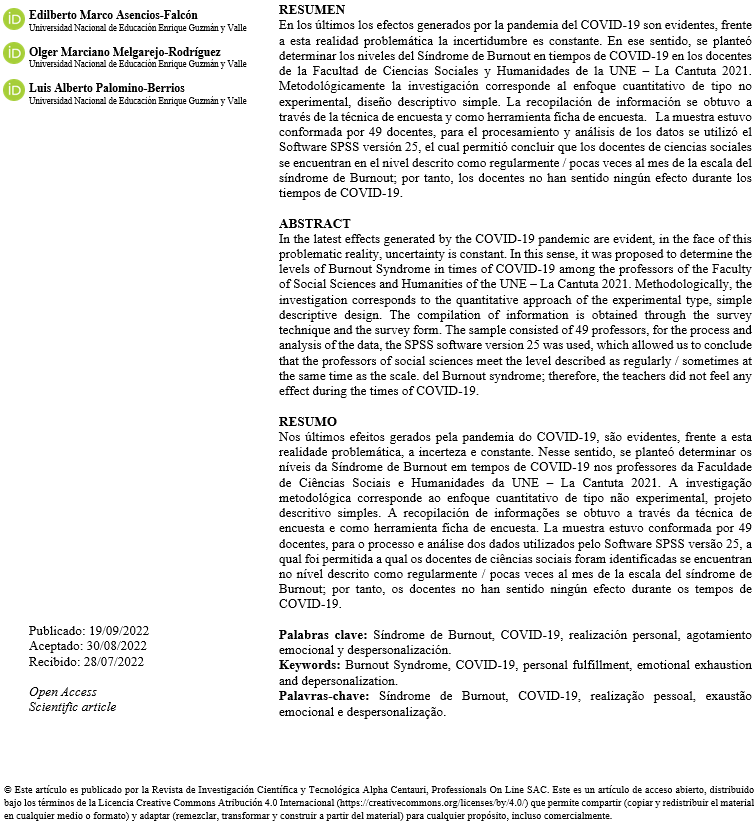 En este contexto y conociendo la importancia de evitar el estrés en los docentes, ha sido necesario aplicar la escala de Burnout a los docentes de la Facultad de Ciencias Sociales con la finalidad de evidenciar el nivel se encuentran. Para demostrar los resultados se planteó el objetivo central de determinar los niveles del Síndrome de Burnout en tiempos de Covid en los docentes de la Facultad de Ciencias Sociales y Humanidades de la UNE – La Cantuta 2021, como respuesta al objetivo se concluyó que los docentes de ciencias sociales se encuentran en el nivel regularmente / pocas veces al mes de la escala del síndrome de Burnout; por tanto, los docentes no presentan efectos durante los tiempos de COVID-19.