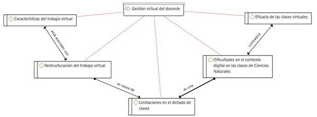 Se verifica que existen varios enlaces dentro de la red hermenéutica esto es debido a sus subcategorías, entre las que destacan, podemos encontrar a la relación causal provocada por las limitaciones en el dictado de clases hacia la restructuración del trabajo virtual que está asociado a la vez con las características del trabajo virtual, se explica la relación de causalidad puesto que gracias a las limitaciones generadas por la virtualidad de las clases se plantean procedimientos que deben ser mejorados. Las mismas limitaciones en el dictado de clases son también dificultades en el contexto digital que se da en las clases de Ciencias Naturales de la FAC-UNE,2021.
