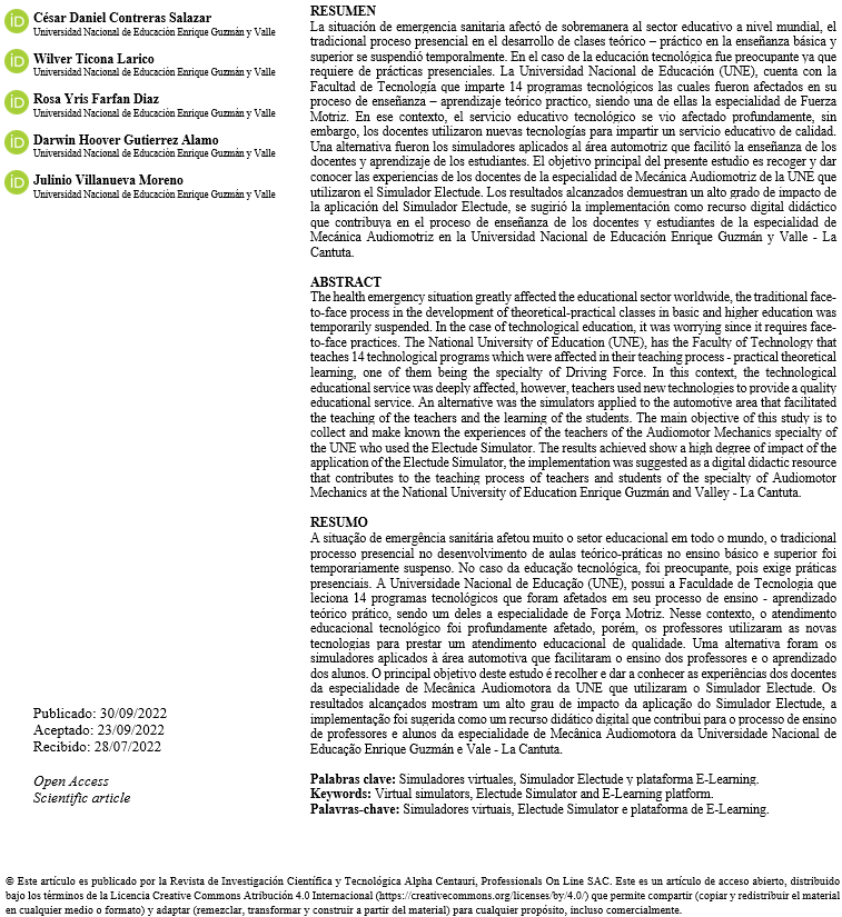 El trabajo de investigación titulado el simulador Electude con el E-learning en los docentes de Mecánica Automotriz 2021, tuvo como objetivo principal dar a conocer las experiencias obtenidas por los docentes, en la enseñanza de la especialidad de mecánica automotriz en sus diferentes niveles y modalidades donde se imparte la especialidad haciendo uso de una herramienta digital como es el Simulador Electude.