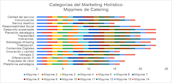 En la Figura 1, se observa el comportamiento de cada Mipymes frente a las diferentes categorías del MH definida por cada color, entra más ancho sea el color, significa que no lo aplica; y entre más extensa sea la línea horizontal, indica que la mayoría de las Mipymes no lo aplica.