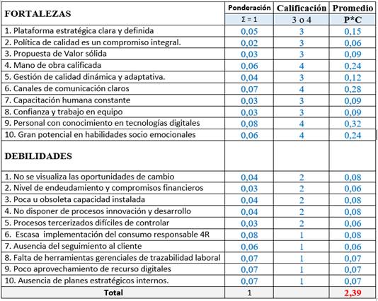 Para David (2013), Los totales ponderados muy por debajo de 2.5 caracterizan a las organizaciones que son débiles en lo interno, mientras que las calificaciones muy por encima de 2.5 indican una posición interna de fuerza. Después de haber sido estructuradas las matrices de factores internos en la actividad del sector de catering en la empresa “Postres y Refrigerios”, fueron calculados los valores ponderados, para cada uno de loas factores calificados obteniendo un valor 2,39. Lo que indica en cada una de ellas que las fuerzas internas no son favorales para la empresa. Por tanto, se debe establecer una estrategia empresarial para brindar la oportunidad de reforzar las fortalezas, reduciendo al máximo las debilidades.