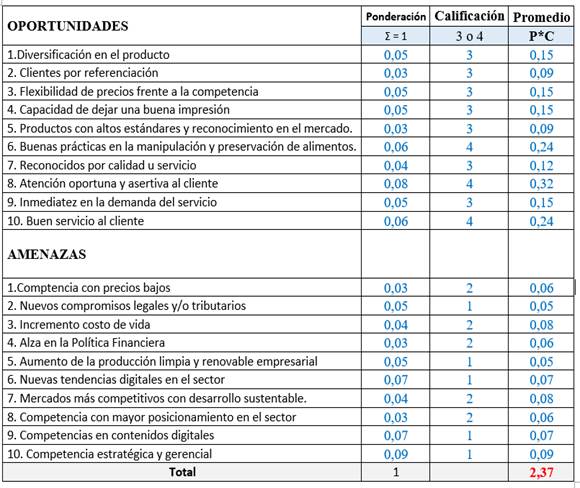 Los pasos para la realización de la matriz MEFE son los mismos que los expuestos en la matriz MEFI. En la Tabla 2, se consideran solo las fortalezas y amenaza desde MEFE.