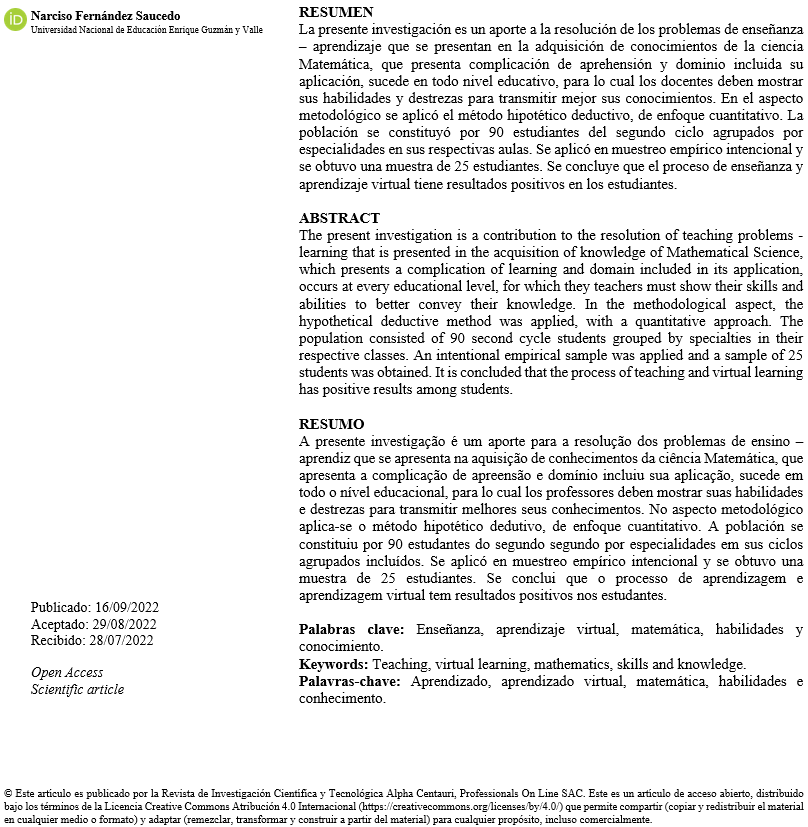 La presente a investigación aplica el enfoque cuantitativo, de tipo aplicado y diseño cuasi experimental, se planteó con el objetivo de determinar la influencia de la enseñanza virtual sobre el aprendizaje de Matemática II, de los estudiantes de segundo y tercer ciclo en la Facultad de Ciencias de la Universidad Nacional de Educación. Se trabajó con una muestra intencional de 25 estudiantes en el grupo experimental y también se determinó un grupo control de 25 estudiantes, determinándose grupos equiparados. El método utilizado fue en hipotético deductivo ya que se realizó el contraste de las hipótesis de lo general a lo particular.